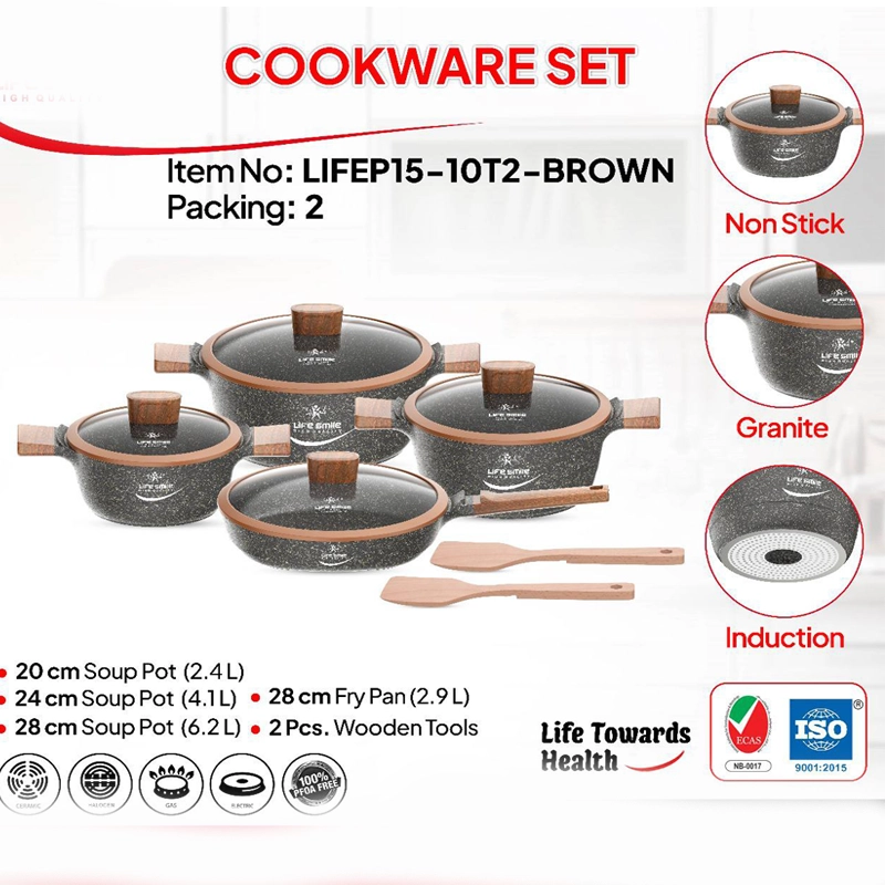 - قابلمه های مقاوم با طراحی حرفه ای برای آشپزی مطمئن: سرویس قابلمه 10 پارچه لایف اسمایل lifep15-10t2 از تیتانیوم با روکش گرانیتی ساخته شده است. این ترکیب مقاومت بالایی در برابر ضربه و حرارت ایجاد می کند و شکل و کیفیت سرویس را حتی بعد از استفاده طولانی حفظ می کند.