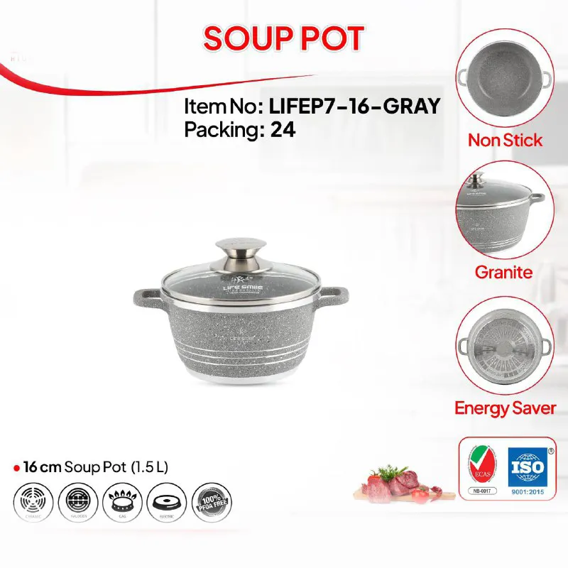 سطح نچسب قابلمه، پخت بدون روغن و شستشوی آسان، سه ویژگی مهمی هستند که در این مدل گرد آمده‌اند. قابلمه تک گرانیتی سایز 16 لایف اسمایل مدل LIFEP7 انتخابی هوشمند برای آشپزخانه‌های مدرن است.